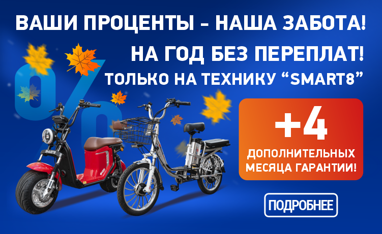 Преобрели электровелосипед Smart8 Dacha! Заказывал две штуки! Себе и жене. Покупал на акции. Всё объяснили и показали. Качество хорошее. В работе время покажет. В общем рекомендую к покупке.