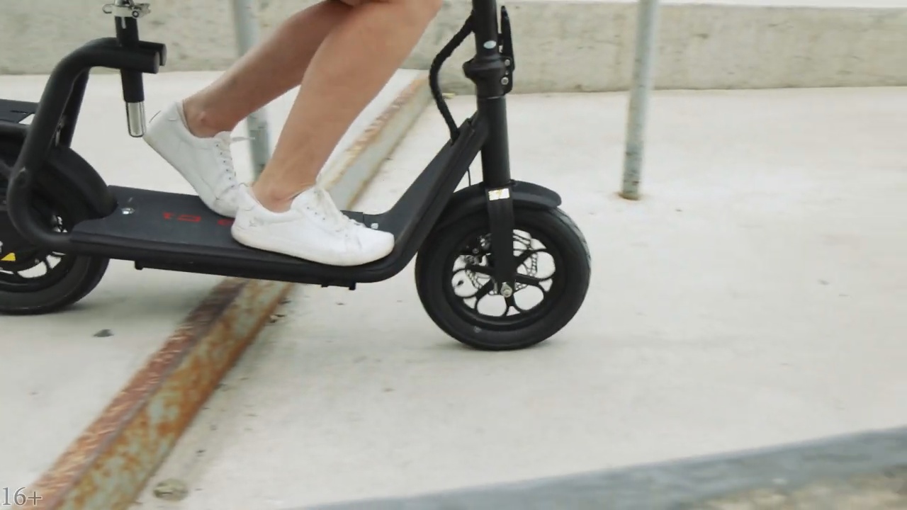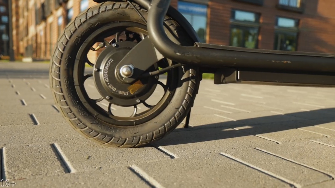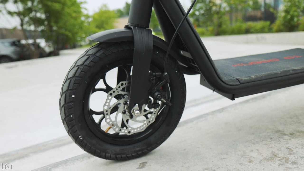 - Колёса у электронного самоката в диаметре 12 дюймов, за счёт этого создаётся высокий клиренс, позволяющий ездить не только по городу, но и по бездорожью. Кроме того, колёса надувные, что смягчает езду по неровной дороге. Оба колеса оснащены дисковыми тормозами, рукоятки от которых находятся на руле