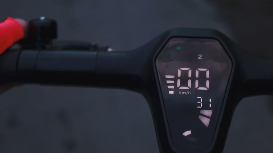 - На дисплее отображаются: выбранный режим скорости, текущая скорость, общий пробег, заряд батареи и справа, и слева есть 2 шкалы отображающие степень нажатия тормоза и газа, соответственно.
