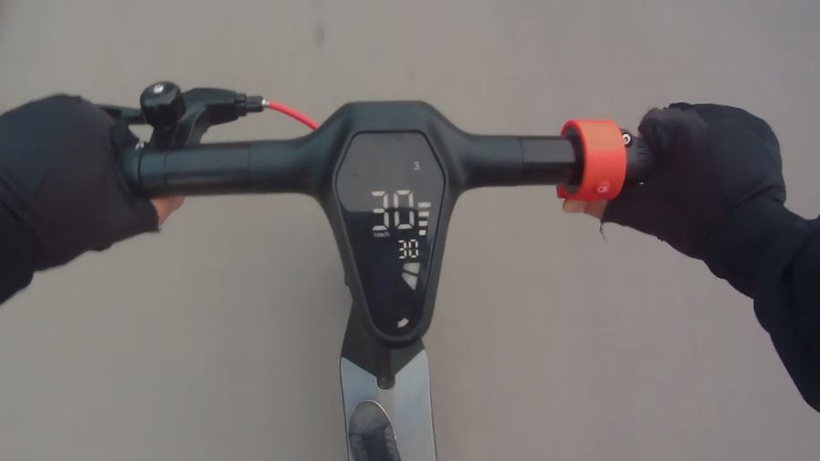 - Селектор газа сделан под большой палец. тут же рядом кнопка включения освещения. И кнопка включения электросамоката. Она же, собственно, и переключает скорость.