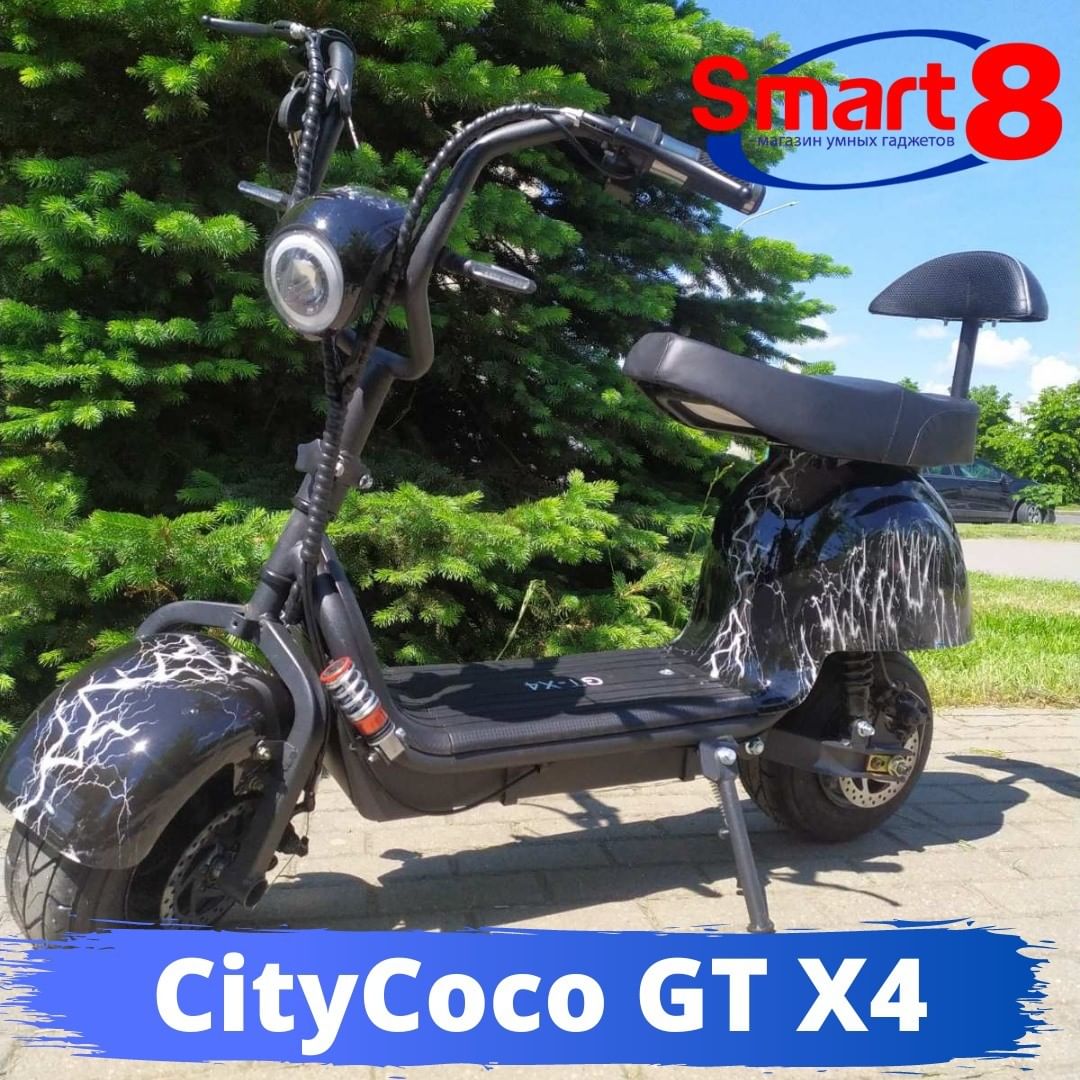 Данная модель электроскутеров GT CityCoco X4 48V/13Ah отличается от своего собрата более компактными размерами, но едва ли уступает по мощности. Электроскутер GT X4 оборудован мощным фонарём и стоп сигналом. Этот экотранспорт станет вашим лучшим двухколесным другом, и при этом обеспечит поездки вдвоем: за счет прочной конструкции он выдерживает до 150 кг!