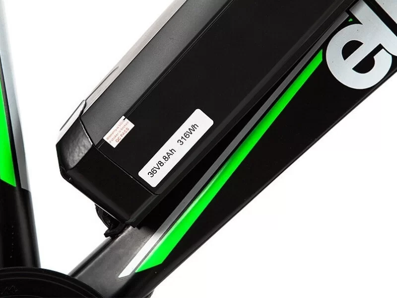 - Мощный двигатель. Мотор расположен на задней оси колеса. Литиевая батарея снимается для подзарядки. Для правильного баланса веса аккумулятор емкостью 9Ah крепится снизу треугольника рамы. Райдер, используя возможность двигателя, может набрать скорость до 35 км/ч и проехать до 50 километров. Но так как истинные спортсмены используют мотор только на самых трудных участках дороги, а чаще предпочитают крутить педали, то расстояние передвижения увеличивается многократно. Когда работает двигатель, райдер может отдохнуть и набраться сил для очередного рывка. Просто нажмите на рычаг газа.