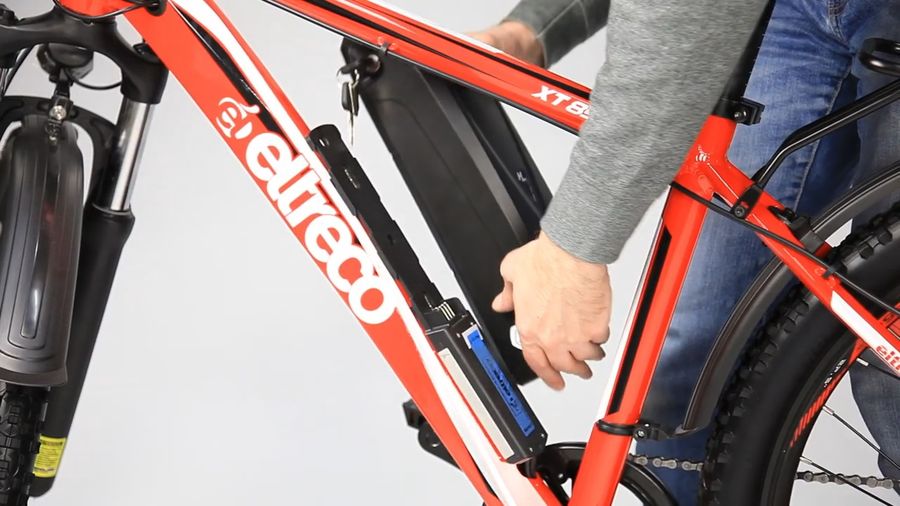 АКБ быстросъемная. При необходимости ее можно быстро демонтировать с рамы при помощи ключа. В съемном виде аккумулятор гораздо удобнее заряжать. На батарее расположена независимая кнопка проверки заряда. Ориентироваться на уровень последнего можно по шкале. С правой стороны корпуса АКБ расположен разъем для зарядки.