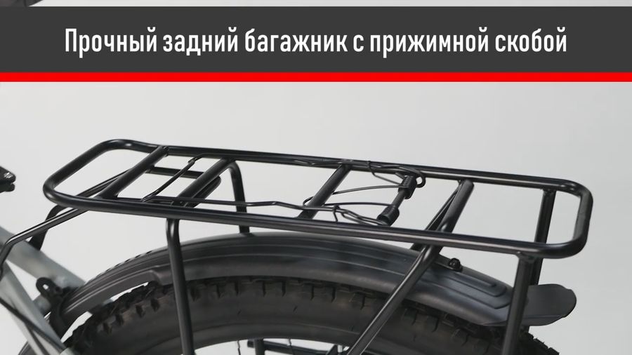Багажник простой, прочный, прикручен к раме. Имеет достаточно тугую прижимную скобу. Рюкзак или сумку точно удержит. Его грузоподъемность составляет 20 кг.