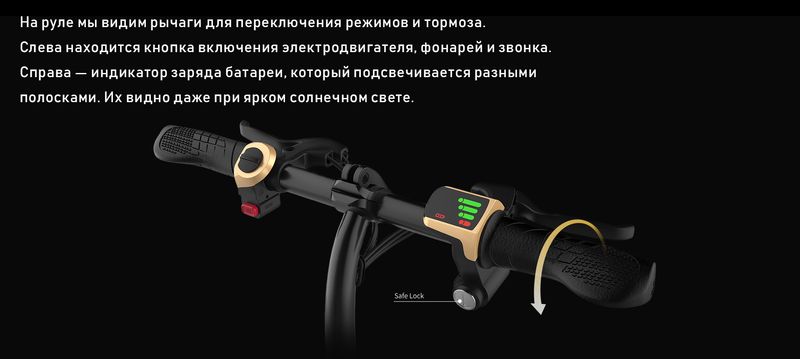 - одна зарядка позволит проехать до 70 километров (перед первой поездкой нужно заряжать электрический велосипед в течение шести часов) – эта цифра с расчетом езды на двух режим; если речь об одном, то - до сорока километров