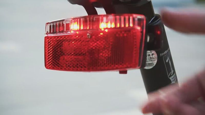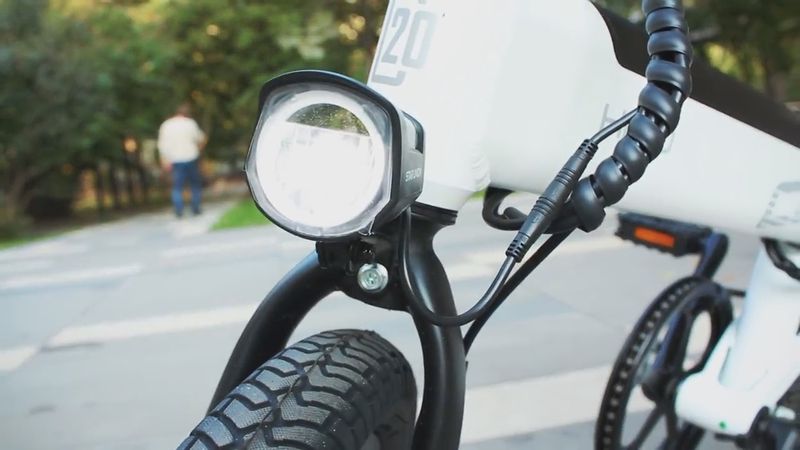 Над передним колесом располагается светодиодная фара с белым свечением. Сзади находится лампа красного цвета. На педалях имеются отражатели.