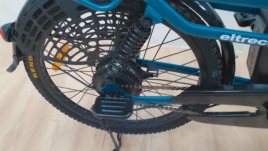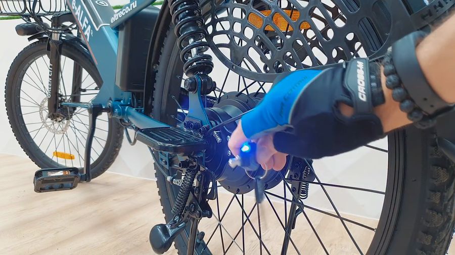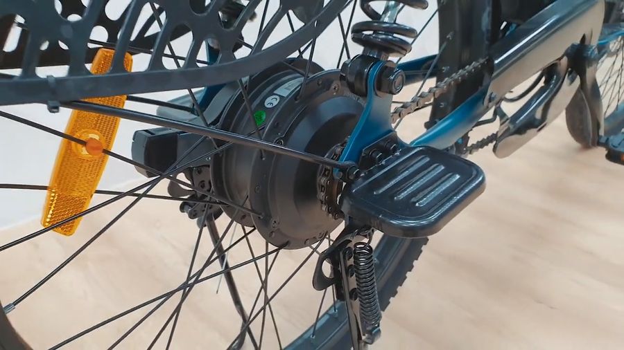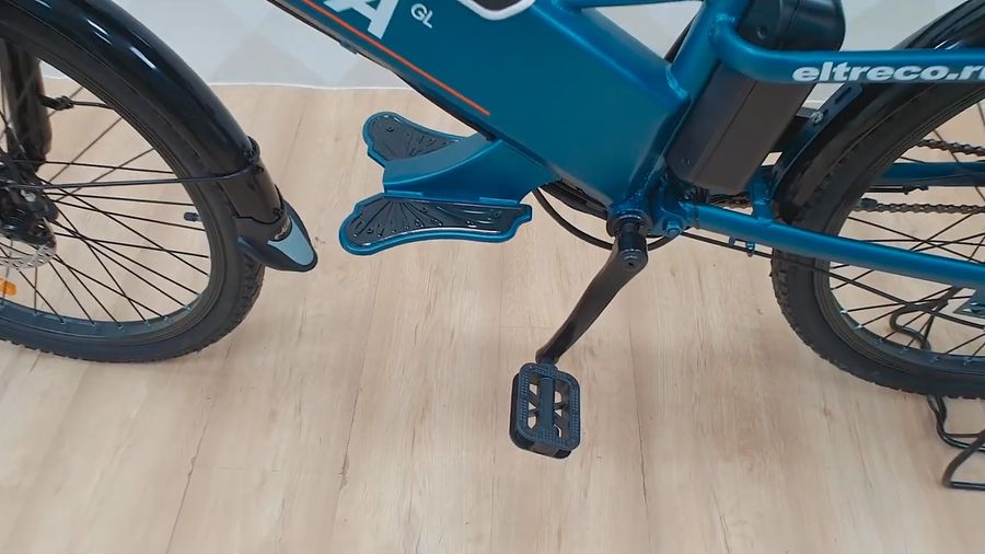 - Как и другие транспортные средства этой серии, велогибрид имеет подножку, о которой мы упоминали выше. Она расположена по центру, что очень удобно.
